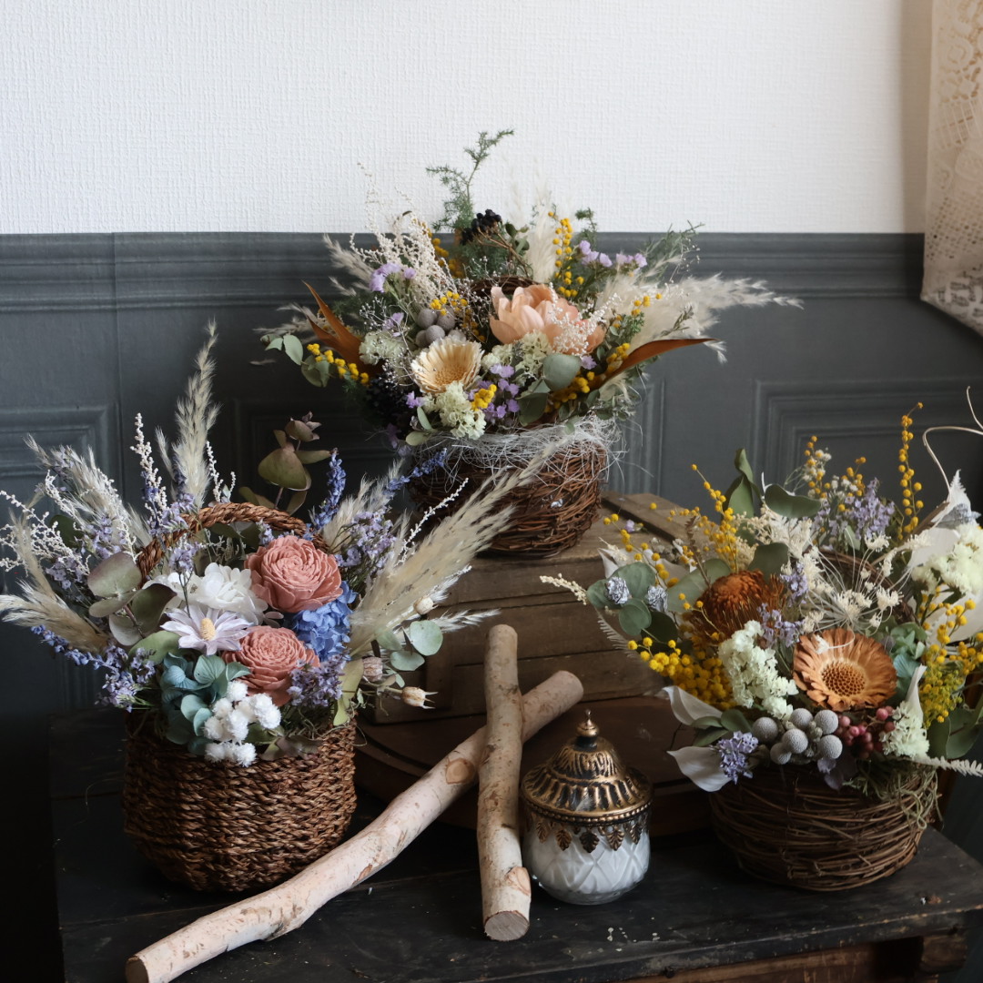 暮らしに寄り添うドライフラワーのお店です。リースやバスケットアレンジや花材販売など贈り物にも喜んでもらえるような作品を販売します。