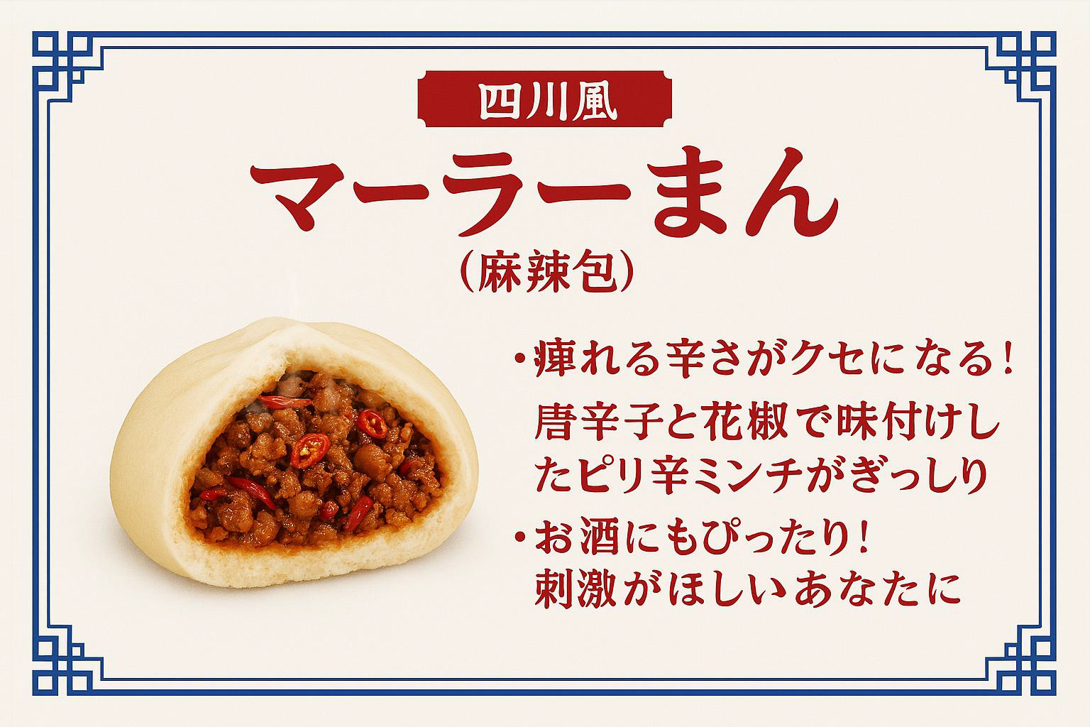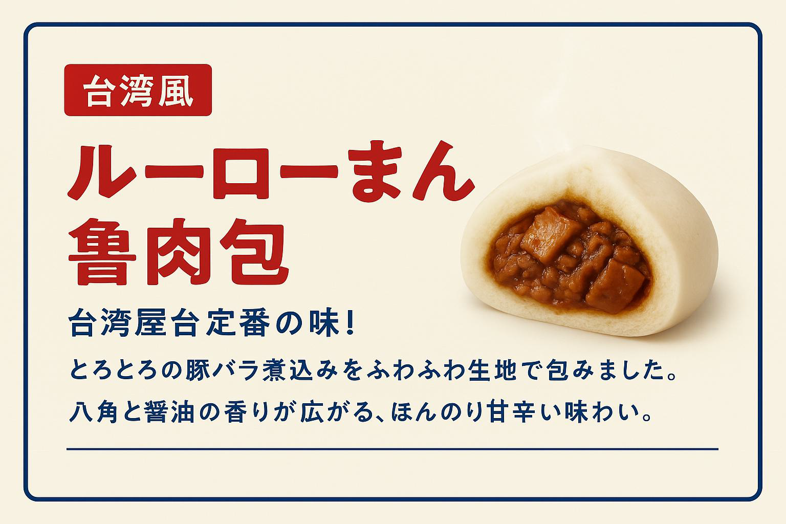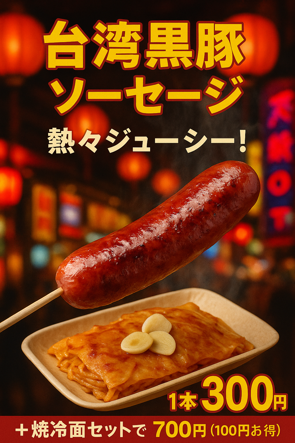ひと口サイズ肉まん、水餃子、胡麻団子、豆花、葱油餅、ニラ玉パイ、ポテトしりしり巻き、中華混ぜ麺、台湾黒豚ソーセージ、ジーパイ、フライドポテト、タピオカミルクティー、白桃烏龍茶、酸梅湯、黒胡麻ドリンク、麻辣湯(マーラータン)、焼き冷麺