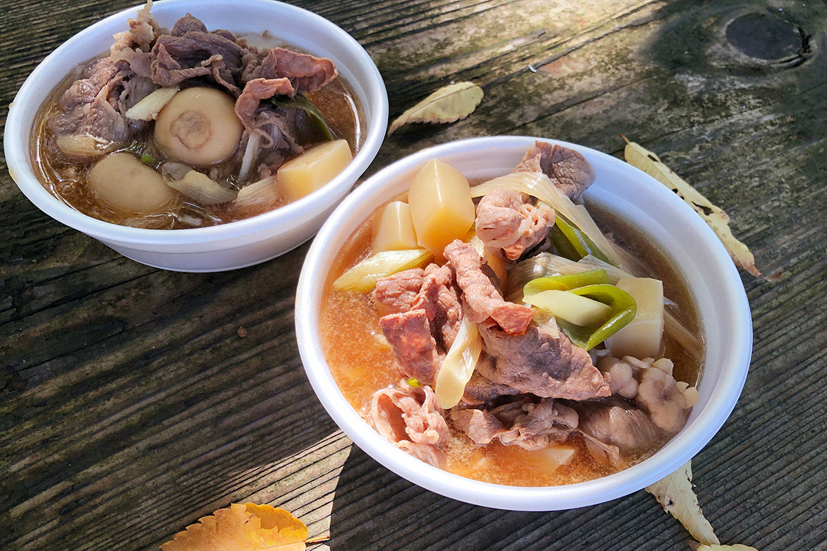山形芋煮、肉巻きおにぎり、ホットドリンク(自家製レモネード)