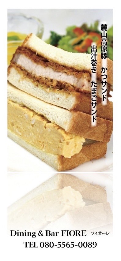 Fiore名物!麓山高原豚ロースカツサンド、厚焼きだし巻きタマゴサンドの他、当日限定メニューや、具沢山のクラムチャウダ等など、ご用意してお待ちしております!